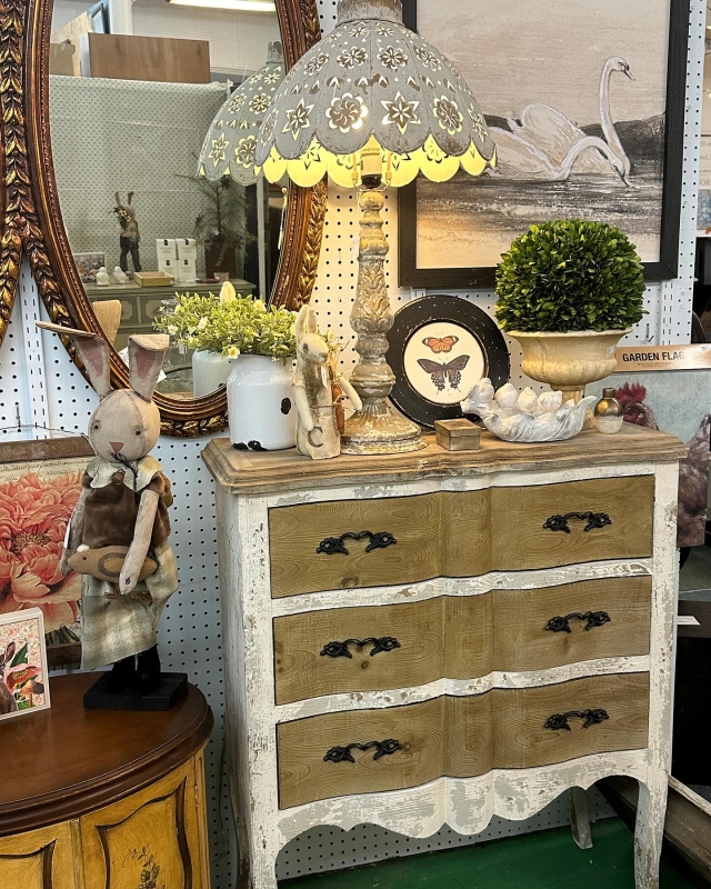We are located in Downtown Aiken. As a shop of Words and Whimsy we seek out items that are fun, creative and unique. We love to blend Primitive Antique farmhouse pieces in with everyday decor. We seek out artists and craftsman who also share a love of whimsy. As for the words, we stock a broad range of vintage titles from classics to decorative bindings.