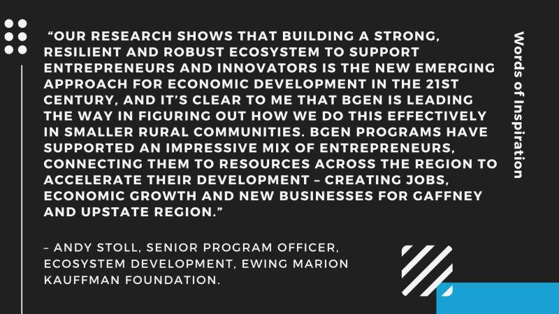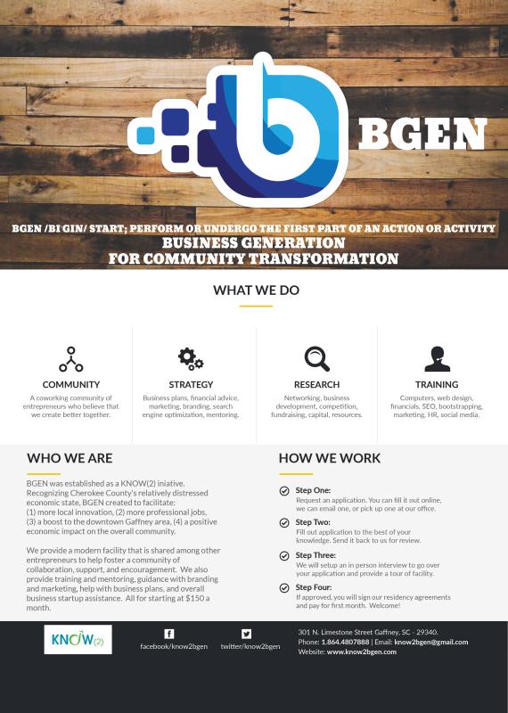 Located in historic downtown Gaffney, SC right next door to City Hall and the City of Gaffney Fire Department. BGEN (pronounced “begin”) works with start-up companies, entrepreneurs, freelancers, creatives, and the mobile workforce to help by providing workspace, mentorship, expertise, access to networking, educational resources, and sometimes capital (in the form of micro-loans via our community partners).